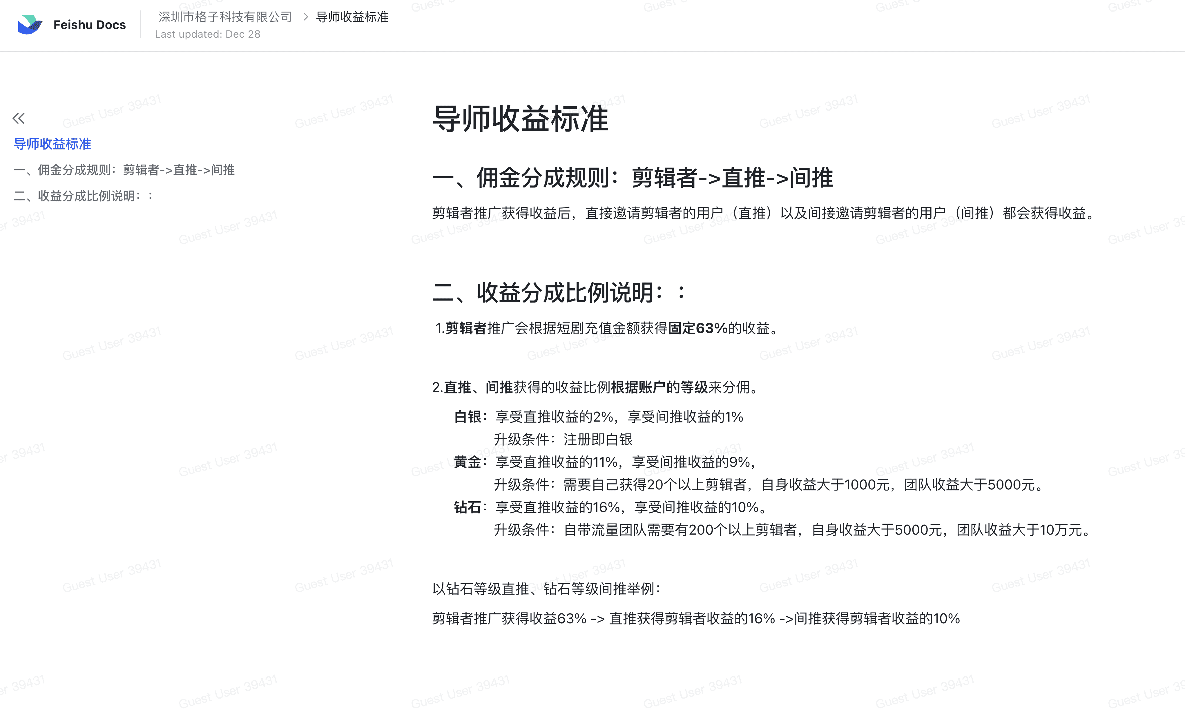 白银:享受直推收益的2%,享受间推收益的1%,升级条件:注册即白银 黄金:享受直推收益的11%,享受间推收益的9%,升级条件:需要自己获得20个以上剪辑者,自身收益大于1000元,团队收益大于5000元。 钻石:享受直推收益的16%,享受间推收益的10%,升级条件:自带流量团队需要有200个以上剪辑者,自身收益大于5000元,团队收益大于10万元。 以钻石举例: 剪辑者推广获得收益63% -> 直推获得剪辑者收益的16% ->间推获得剪辑者收益的10%
