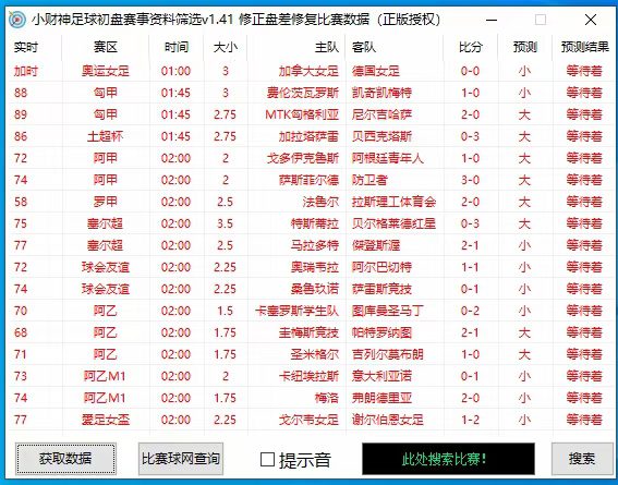 最新版小财神足球初盘赛事资料筛选脚本,能实时获取全球足球比赛的协议资料,蛇货料,结果,胜率,足球最新协议资料蛇货单一手获取,可用于赛前分析,作为判断使用,会员自测准确率达百分之80以上