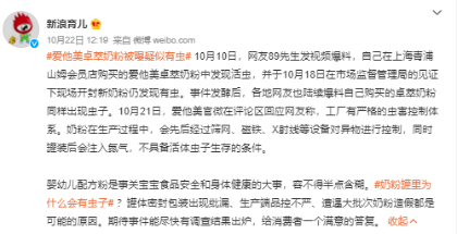 而“宝妈买爱他美奶粉开罐遇活虫”也登上微博热搜,截至当前,近日话题阅读量已超过1700万。