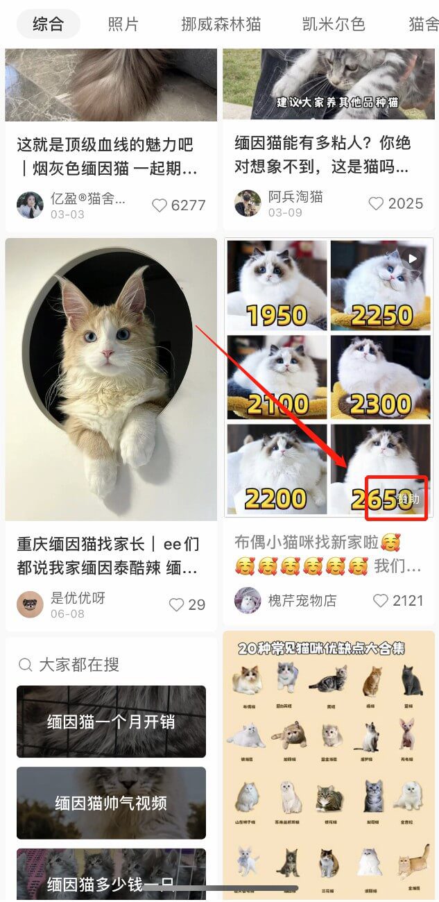 在小红书平台搜索“缅因猫”这个关键词,找到那些在做付费投放的账号全都记录下来。如下图所示,右下角有“赞助”二字的都是投了广告的。