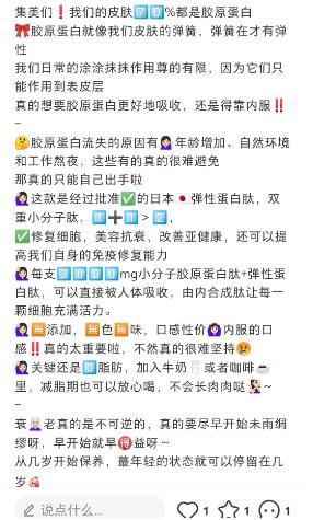 首先讲一堆大道理,生怕用户不知道什么是“胶原蛋白”,其次来1、2、3、4、。。。把卖点全部摆出来,完全不去考虑用户听不听得懂,记不记得住。最后又回到一开头的语气,没有做任何的引导和钩子。