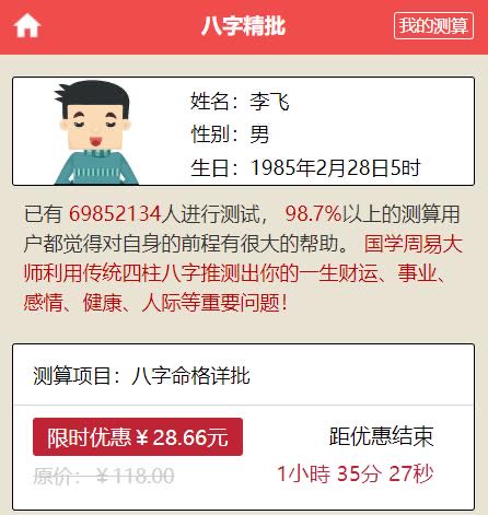 类似这样的广告很多,存在即合理,总有一个能吸引你点进去试试。当你点进去的时候,一般的套路都是先收集下你的生辰信息,然后继续引导你