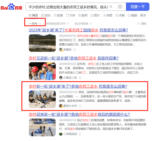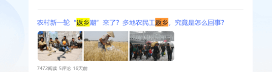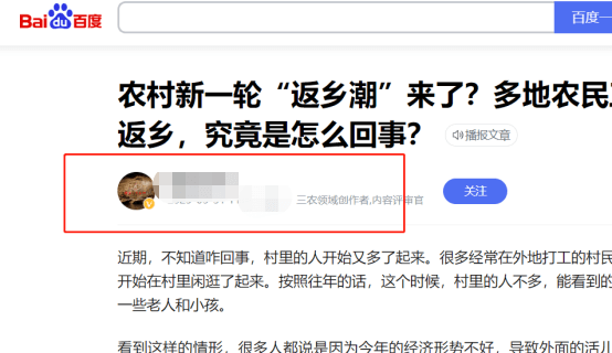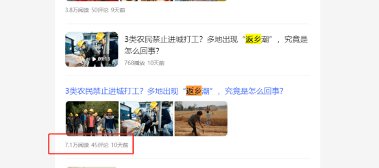通过搜索我们可以看到他写了不止一篇,以农民返乡为主题的文章,而且阅读量都还可以,说明这个选题就非常不错,不然他也不会重复写。