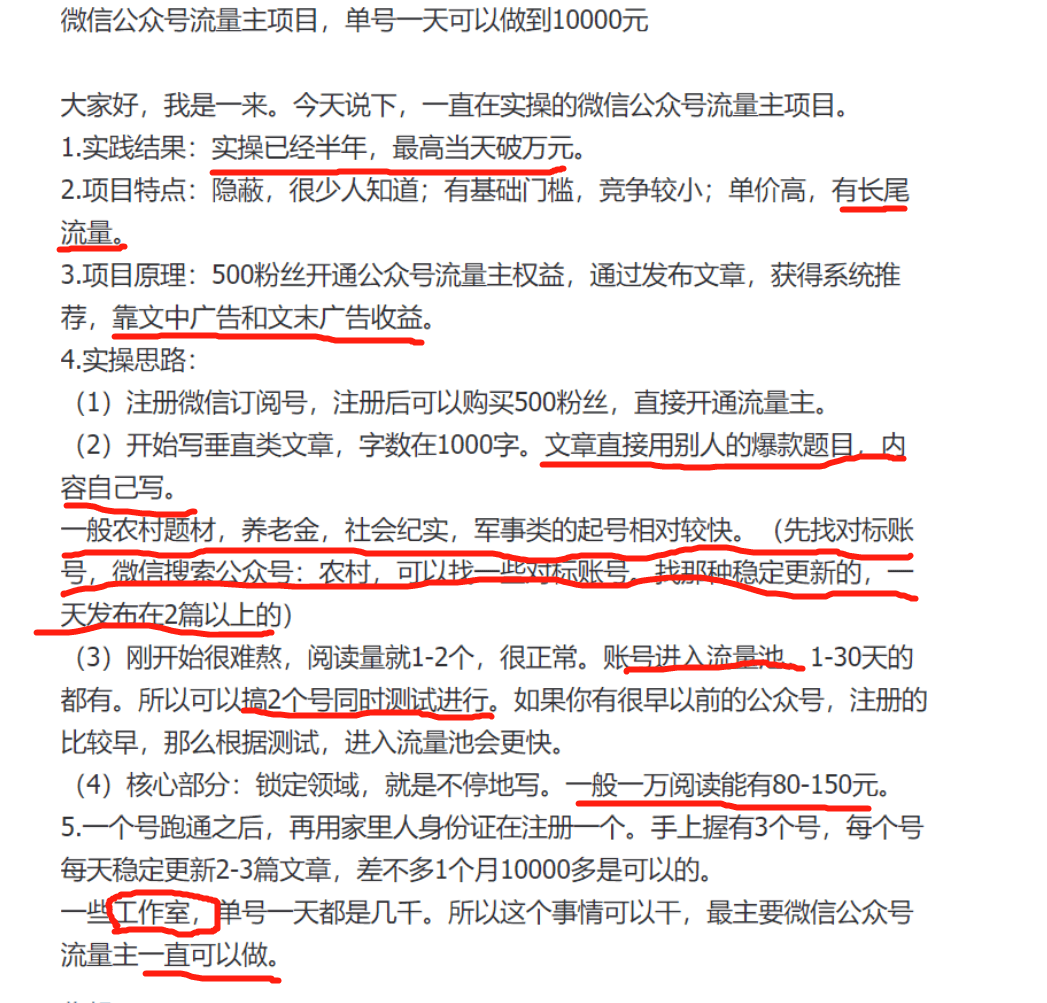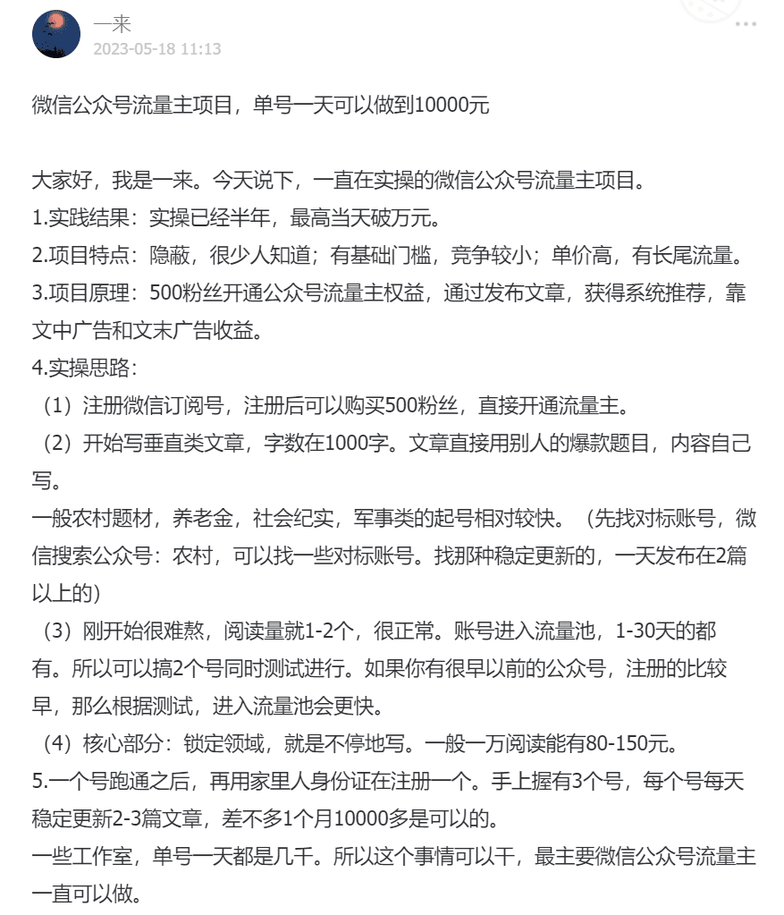 我切入公众号流量主这个项目, 当时是看到一来分享的一条信息。
