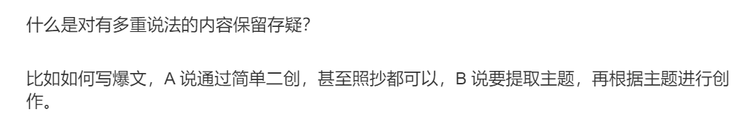 比如如何写爆文,A 说通过简单二创,甚至照抄都可以,B 说要提取主题,再根据主题进行创作。