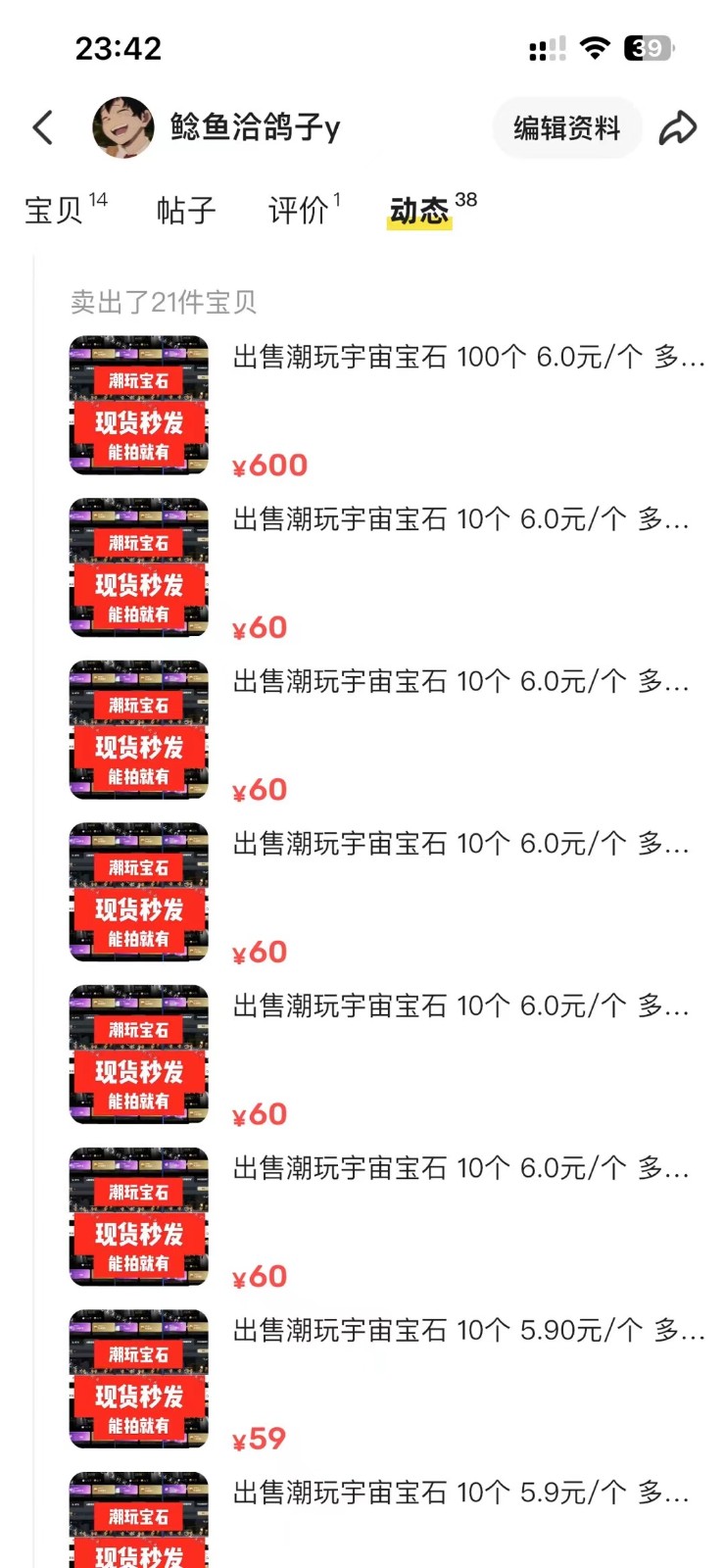 这个宝石的需求量有多大呢 你去咸鱼搜一下就知道了 缺货排行榜top1 可以说秒上架秒被人付款拍下